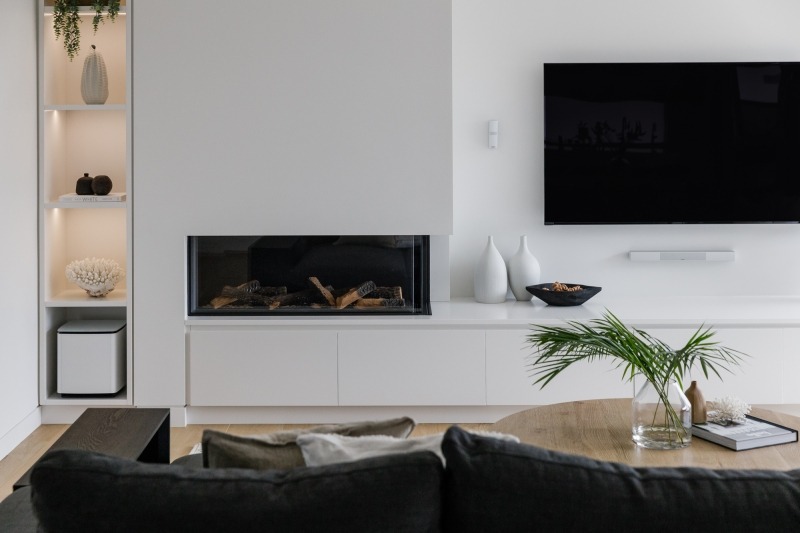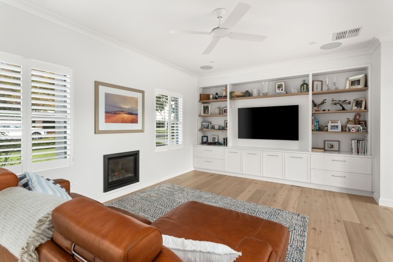 This project has it all, the concealed blinds, the media joinery, the lining boards behind the TV and the fireplace. An amazing place to be in winter and enjoy company. These upgrades are easily installed at a later date and can be deferred to alleviate upfront costs now.